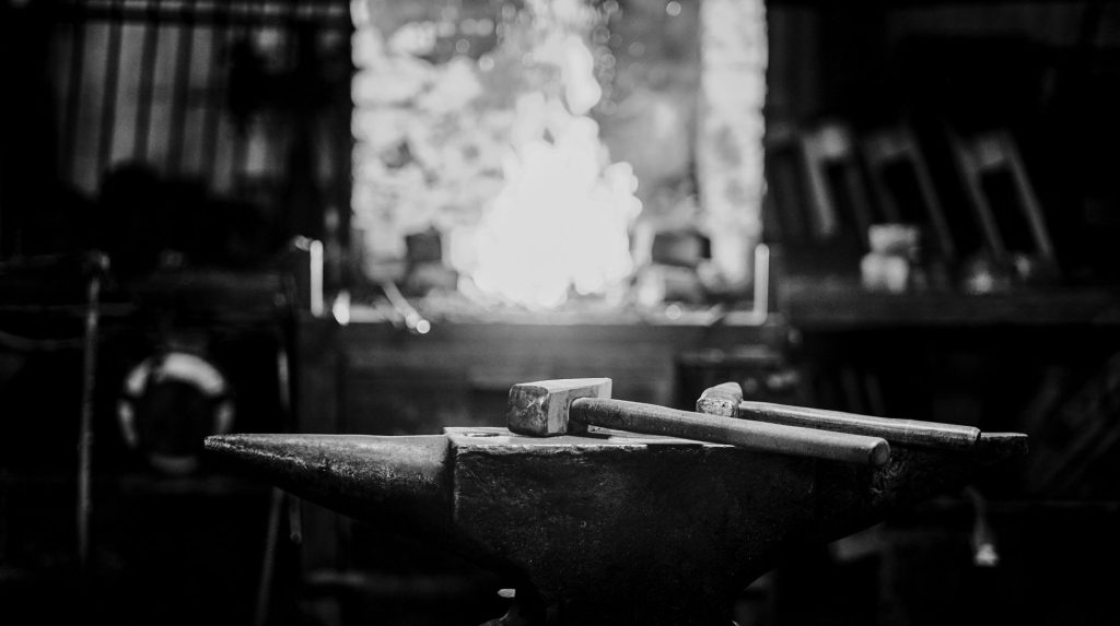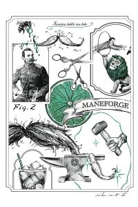 At the bottom, a mustache is shaped on an anvil. The anvil is part of the MANEFORGE mark itself. Hair isn’t styled. It’s forged.