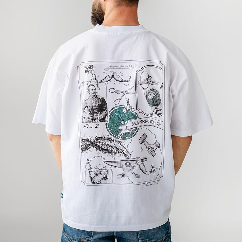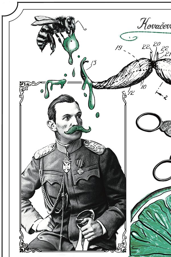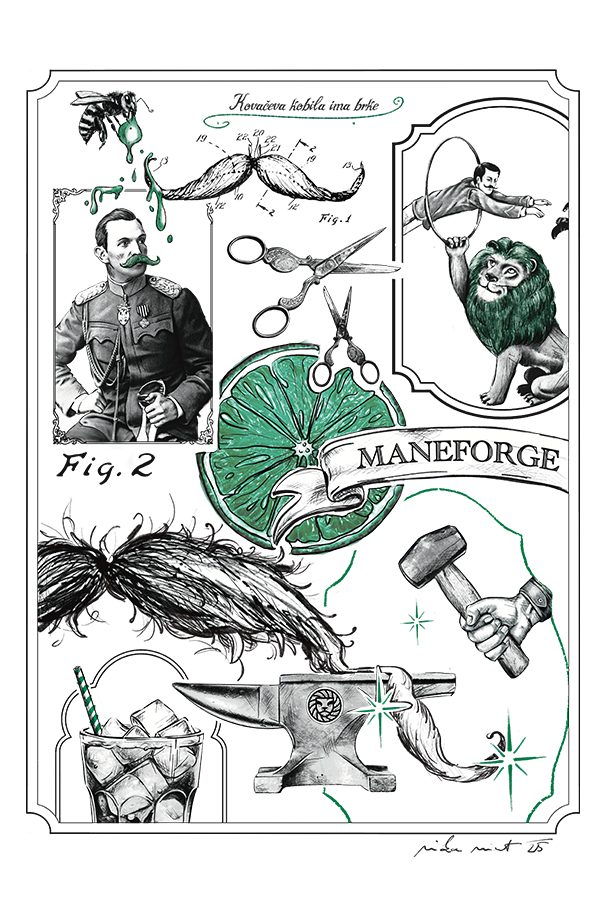 On the left, a caricature of a general with a distinct mustache. A reference to discipline, presence, and Slovenian / Styrian heritage — where craft and appearance were taken seriously. This is where MANEFORGE comes from.