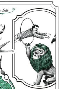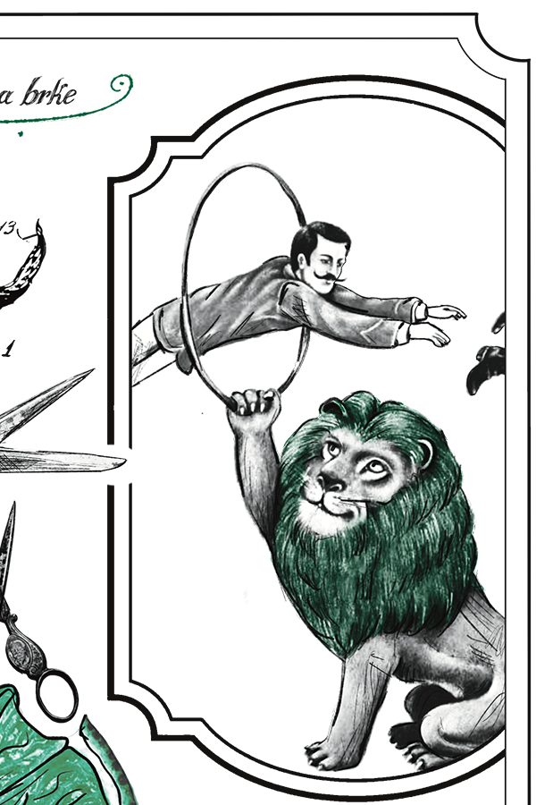 On the right, a man jumps through a ring held by a lion. A symbol of courage, precision, and commitment. Nothing well-made is created without a test.