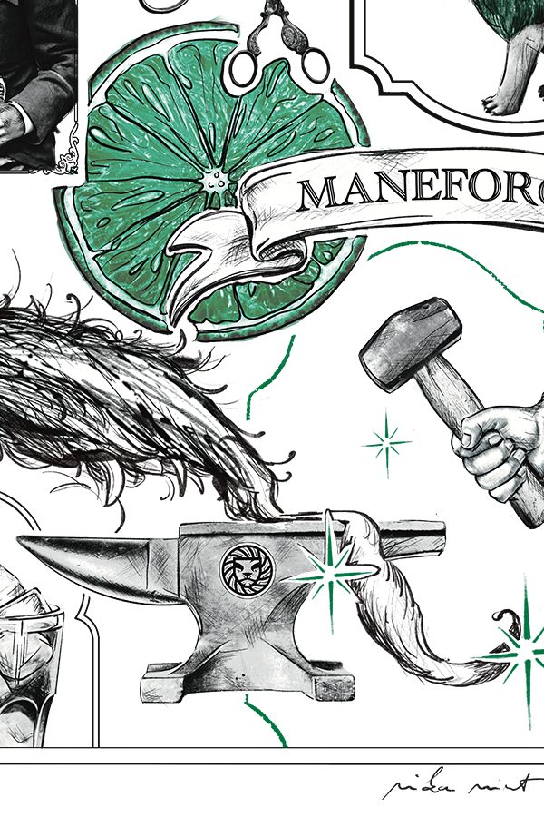 The illustration references the foundations of MANEFORGE. Beeswax for structure. Citrus for freshness. Ice for the cooling effect of the Arctic line. Grooming translated into visual language.
